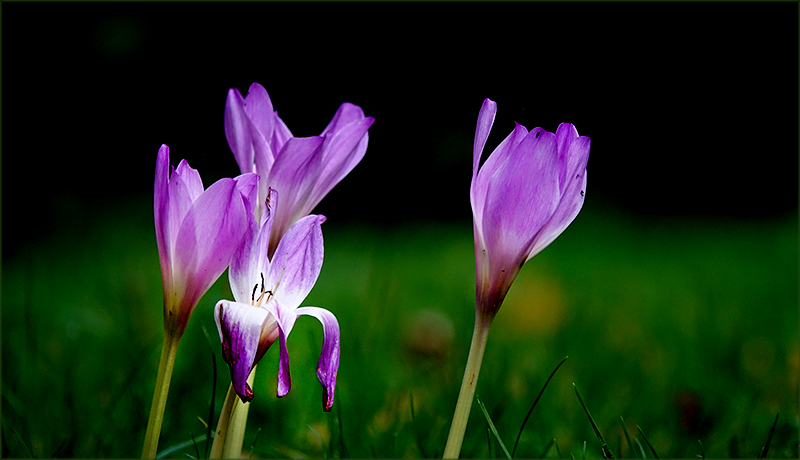 Ein sehr schönes Bild. Die im Sonnenlicht leuchtenden Blüten der Herbstzeitlosen, ragen von der verschwommen grünen Wiese aus bis in das Dunkel des Hintergrundes der die obere Hälfte des Bildes ausmacht.