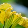Faszinierend schön diese gelben gekräuselten Blütenblätter der Kürbisblüte. Dazu der zartbläuliche Lichtbogen um die Blüte herum, der hellgrüne Hintergrund in der linken unteren Ecke des Bildes und der dunkelgrüne Hintergrund in der rechten oberen Ecke des Bildes, bringen die Blüte schön zur Geltung.