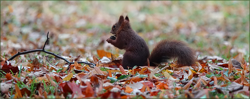 Ein sehr schönes Bild mit schönen Lichtverhältnissen. Es vermittelt mit dem Eichhörnchen in der Mitte eine friedvolle Herbststimmung. Auch eine wohltuende Ruhe geht von dem Bild aus.