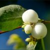 Schneebeeren sind sehr schön und auf dem Bild hier schön platziert. Der blaue Himmel im Hintergrund und die zum Teil durchleuchteten grünen Blätter bringen die weißen Beeren schön zur Geltung.