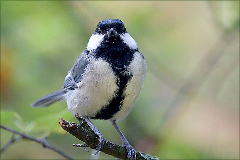 Auch hier sehe ich Lebensfreude in dem Tierchen, das Schnäbelchen zum Gesang geöffnet, die Äugelchen wachsam ebenfalls geöffnet und das schöne Federkleid flauschig und warm. Der grünlich bunte Hintergrund bringt die Meise auf dem knorrigen Ast schön zur Geltung.