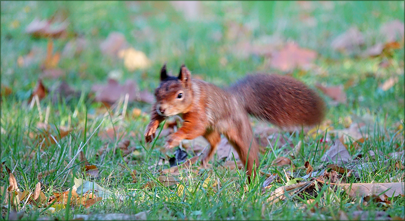 Etwas verschwommen das Eichhörnchen, doch sehr reizvoll. Eine schöne Herbstwiese, mit sehr schöner Lichteinwirkung.
