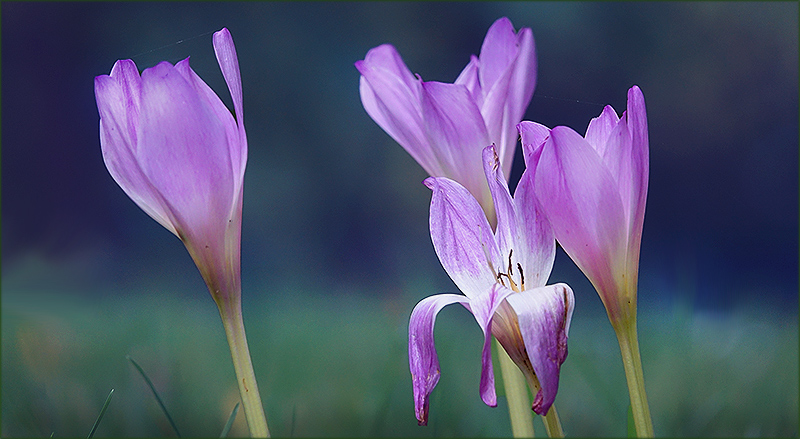 Eine farbliche Pracht, das Violett der Herbstzeitlosen, der verschwommen blaue Hintergrund zu zwei drittel oberhalb des Bildes in den die Blüten hineinragen und der verschwommen blaugrüne Hintergrund zu ein drittel unterhalb des Bildes.