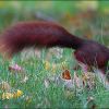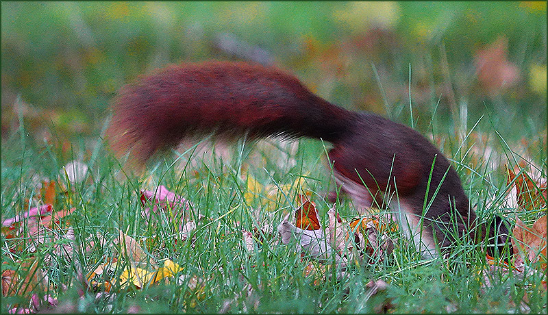 Sehr schöner Schnappschuss, das Eichhörnchen ist so emsig bei der Sache, dass es mit Hinterteil und Schwanz förmlich in der Luft steht. Auch eine wunderschöne Herbstwiese.