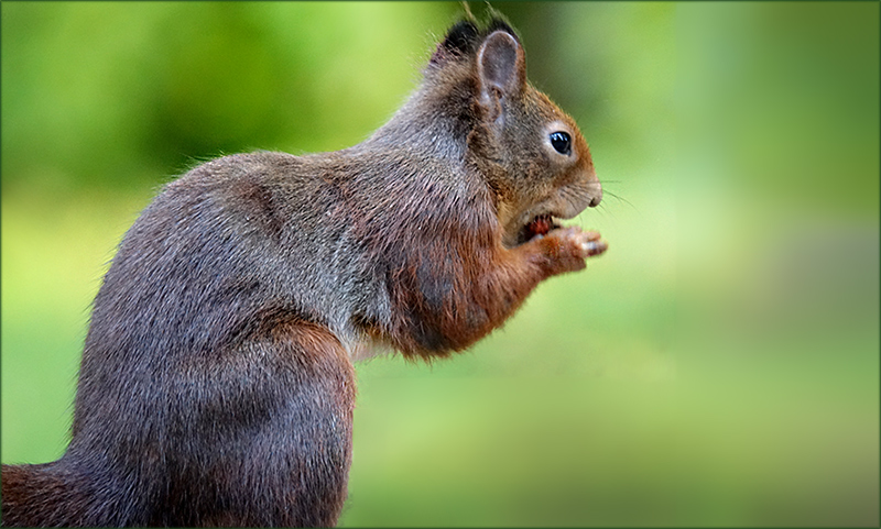 Sehr schön zu sehen das weißbläulich grau schimmernde Fell des Eichhörnchens. Geschickt hält es in den Vorderpfoten die Nuss und knabbert daran. Es ist dabei sehr wachsam. Der grünlich gemischt verschwommene Hintergrund, bringt das Tier schön zur Geltung.