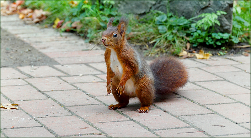 Wie ein kleines Menschlein steht es da, ja, es ist dabei ganz wachsam. Schaut es nur, oder wartet es auf etwas? Es sieht übrigens sehr zahm aus. Solch ein Zahmsein in Freiheit, ist etwas ganz anderes, als das Zahmsein eines Tieres in Gefangenschaft, das Wildtierhalter stolz anpreisen als Rechtfertigung für ihre Tierliebe zu Wildtieren in ihren Käfigen. Sie rühmen sich auch damit wie gut es solche Käfiginsassen bei ihnen haben. Niemals würde ein Wildtier freiwillig in einen Käfig gehen. Wie süß ist doch dieses Eichhörnchen hier in Freiheit.