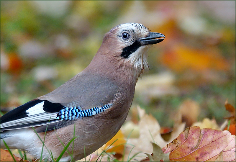 Ein sehr schönes Bild, der Eichelhäher mit prächtigem Gefieder und sprechendem Blick. Was mag er wohl sagen? Dazu das bunte Herbstlaub und der verschwommen bunte Hintergrund, geben dem Bild eine sehr schöne Beschaulichkeit.