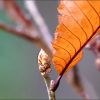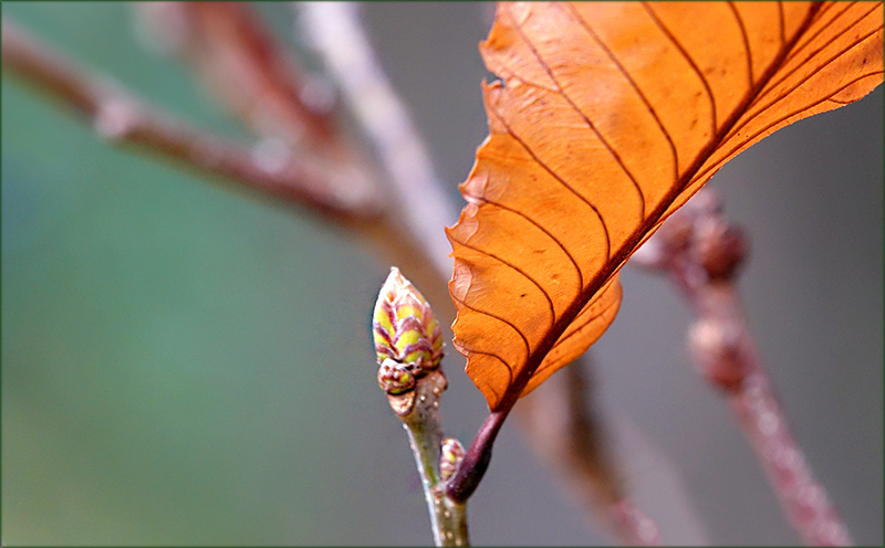 Ein sehr schönes Bild, wundervoll in der Farblichkeit und in den Lichtverhältnissen. Auch hier dieses wesensähnliche Gebilde der Knospe. Der grünliche bis bläuliche Hintergrund mit den verschwommenen Zweigen bringt die Knospe schön zur Geltung. Das aufwärts strebende gelblichbräunliche Blatt mit den rotbraunen Rippen, gibt dem Bild auf Grund des durchscheinenden Lichtes eine interessante Beschaulichkeit.