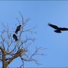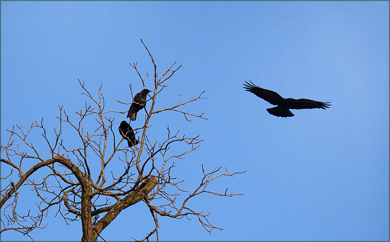 Eine schöne Aufteilung der drei Raben mit dem blauen Himmel im Hintergrund. Sehr schön getroffen den fliegenden Raben in der rechten oberen Goldenen Mitte des Bildes mit ausgebreiteten Flügeln. Auch mit der Krone des Baumes in der linken unteren Ecke, in der die zwei anderen Raben sitzen, ein interessantes Bild.