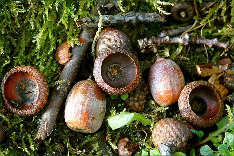 Ein sehr schönes Bild, ein Kunstwerk. Ich liebte schon als Kind die Eicheln und die Käppchen oder Mützchen. Ich habe oft mit den Eicheln und den Mützchen und mit Streichhölzchen Figuren gebastelt, Tiere und Männchen. Auch schön anzusehen auf dem Bild das Moos und das Reisig.