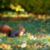 Ein schönes Herbstwiesenbild mit einem schönen Lichteinfall, der das kleine Eichhörnchen schön zur Geltung bringt. Auch der Baumstamm links im Bild mit der rauen Borke trägt zu dieser Schönheit bei, wie auch der verschwommene Waldrandhintergrund.