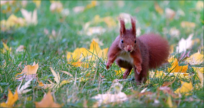 Ein sehr schöner Schnappschuss. Es mag ein großes Glück erforderlich sein, um ein solches Foto zu schießen, aber ohne ein entsprechend gutes Reaktionsvermögen, eine ruhige Hand und ein scharfes Auge, kann so ein Foto nicht zustande kommen. Eine wunderschöne Herbstwiese, das Eichhörnchen zwar ein wenig verschwommen, denn sein Sprung war blitzschnell. Es ist dennoch sehr reizvoll. Das besonders Schöne ist das ganz Spontane in der Mimik des Tierchens und die Körperhaltung. Diese Spontaneität ist eine gesunde Reaktion in der Natur, doch bei uns Menschen nur sehr selten anzutreffen.