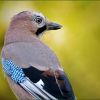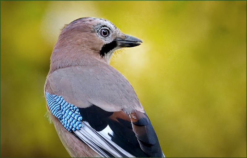 Ein lieblicher Blick und ein prächtiges Gefieder. Der gelbgrünliche mit weißen Lichtflecken vermischte Hintergrund bringen den Eichelhäher schön zur Geltung.