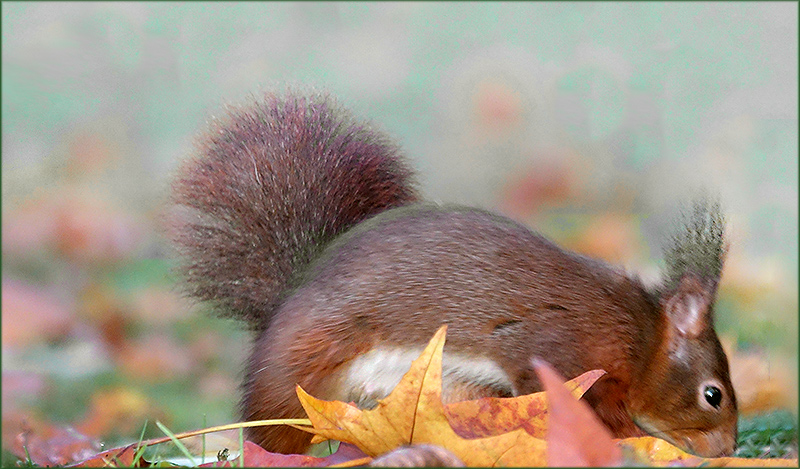 Emsig beschäftigt ist es, und sind sie aber auch oft, diese quirligen süßen Geschöpfe. Eine schöne Mischung aus Herbstlaub, Eichhörnchenfell mit buschigem Schwanz und wachsamem Gesichtchen, und verschwommen bläulichbuntem Hintergrund. Ein sehr schönes Bild in Licht und Farbe.