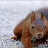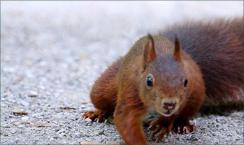 Ein kleines Eichhörnchen und wirkt durch die Nahaufnahme doch ziemlich groß. Sehr schön getroffen, es scheint über den Boden zu kriechen. Ein süßes Gesichtchen. Voller Wachsamkeit schaut es zum Fotografen herüber. Der graue Schotterboden bringt das Tierchen schön zur Geltung. Ein sehr schönes Lichtverhältnis.