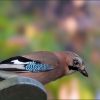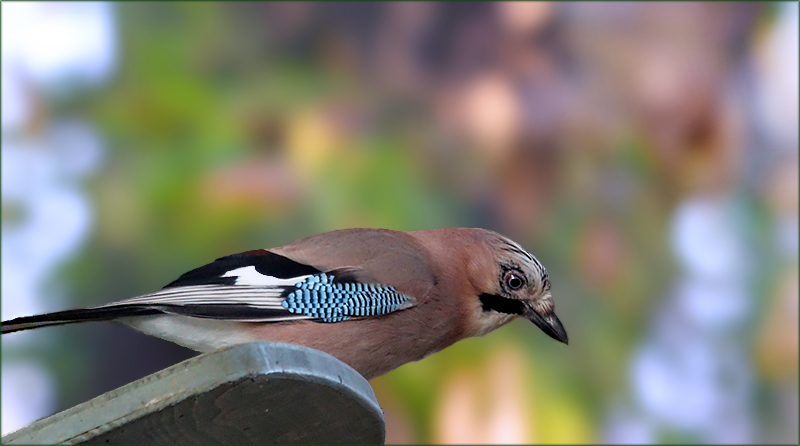 Er scheint etwas erblickt zu haben, worauf er sich hinunterschwingen wird. Es könnte etwas Essbares sein. Ein sehr schönes Bild mit einem schönen grün, blau und violett bunten Hintergrund. Der Eichelhäher mit seinem prächtigen Gefieder, kommt davor schön zur Geltung.