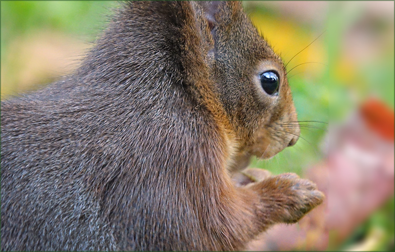 Emsig ist es mit dem Futter beschäftigt. Es wirkt auf Grund der Nahaufnahme gigantisch groß. Ich denke mir, dass wir Menschen aus unserer Position heraus nur groß oder klein sehen, dass aber in Wirklichkeit alles eins ist. Groß und Klein, Innen und Außen, Oben und Unten, alles ist eins. Darin sehe ich auch das Geheimnis des Universums, dass alles eins ist, und dass das gesamte Universum eine einzige Seele ist. Ich glaube, dass unser Gehirn nicht in der Lage ist das Universum sowie unsere Seele zu erfassen oder zu begreifen. Unsere Seele hat keinen Anfang und kein Ende, sie ist wie auch das Universum ein Seinszustand und daher wie bereits erwähnt unerfassbar. Und nochmal zurück zu dem Eichhörnchen, es ist ein sehr schönes Bild, sehr schön der klare Blick des Tierchens zu sehen und das graublauweiß schimmernde Fell.