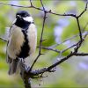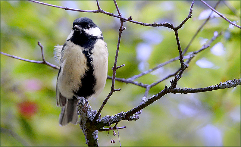 Die Meise, ein süßer Piepmatz, erfreut immer wieder unsere Herzen. Diese hier zwitschert fröhlich ihr Lied, vielleicht markiert sie auch nur ihr Revier. Ein sehr schönes Bild, der verschwommen grünbläulich bunte Hintergrund und das abgestorbene Geäst mit den bläulichgrauen Flechten im Vordergrund, bringen das Tierchen schön zur Geltung.