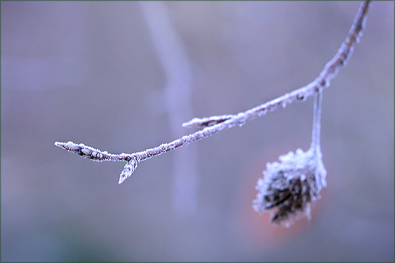 Ein wunderschönes Kunstwerk der Natur und der Witterung. Ein reifbefrorener Zweig mit einer offenen Samenkapsel. Der zart- blau- violette Hintergrund bringt den winterlichen Zweig schön zur Geltung. Sehr schönes Licht- Farbverhältnis.