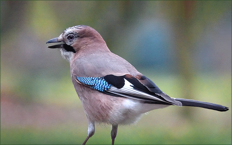Schluckt er gerade oder gibt er die für Eichelhähere so typischen Laute von sich? Jedenfalls schaut er sehr wachsam und zeigt uns sein prächtiges Gefieder. Der bläulich- violett- grünlich- bunte Hintergrund bringt den Vogel schön zur Geltung. Auch dieses Bild voller Harmonie und Frieden. Sehr schöne Lichtverhältnisse.