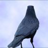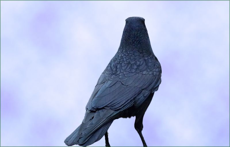 Wunderbare Tierwelt, die Raben sind sehr schöne Vögel, sie können draußen in der Natur zutraulich werden und in Gefangenschaft auch zahm. Ihr schwarzes Federkleid schimmert bläulich, je nachdem wie es vom Licht angestrahlt wird auch bläulich schillernd. Der zartweißbläuliche Hintergrund bringt den Raben schön zur Geltung.