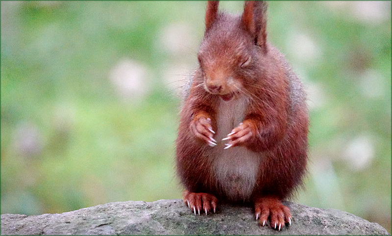 Was mag es wohl ausdrücken? Was mag in ihm vorgehen? Es scheint mir aktiv zu sein, das sieht man an dem geöffneten Mäulchen und an der Körperhaltung. Ein Tierchen voller Rätsel. Ein seltener Schnappschuss, ein Glücksmoment für den Fotografen, aber auch für den Betrachter. Der zartgrünlich- bis weiß bunte Hintergrund bringt das Eichhörnchen auf dem grauen Steinbrocken sitzend schön zur Geltung. Auch ein schönes Lichtverhältnis.