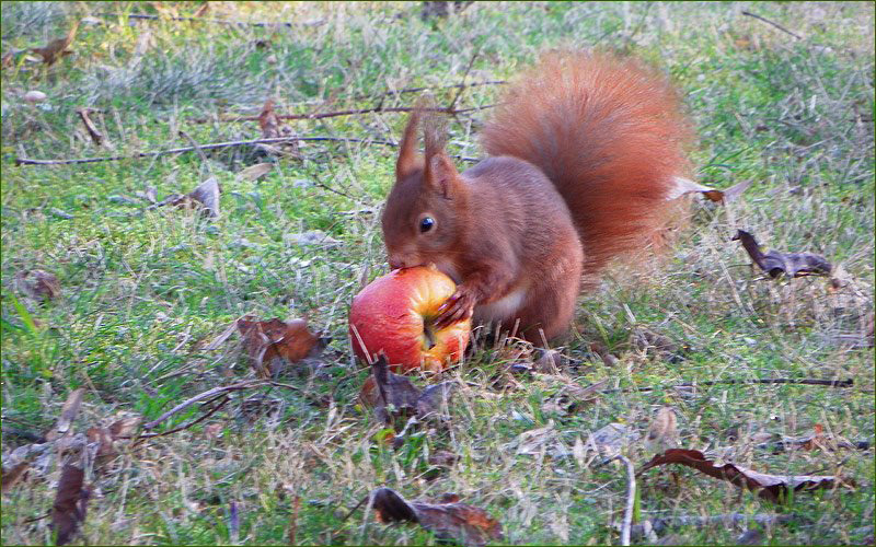 Dieses Foto machte ich vor einigen Jahren. Auch hier trug das Eichhörnchen den Apfel davon und brachte ihn in Sicherheit.