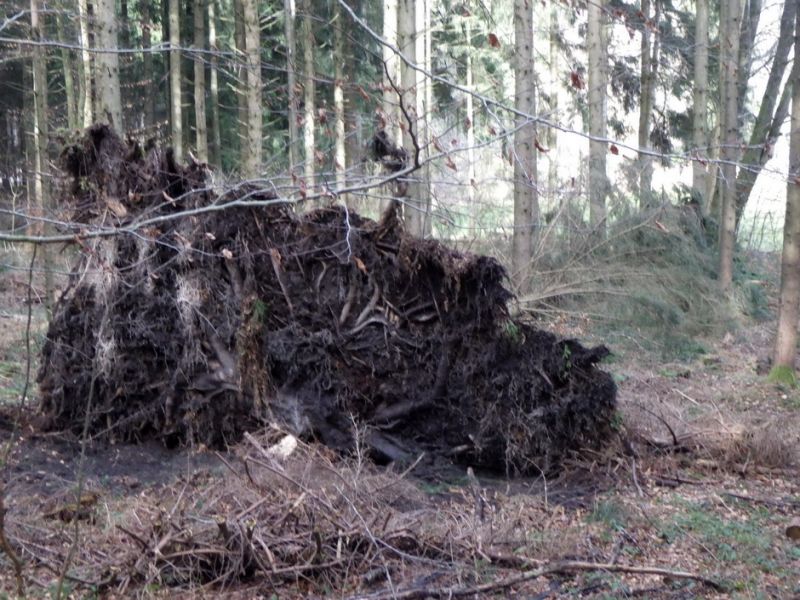 Viele Fichten entwurzeln bei stärkeren Unwettern,