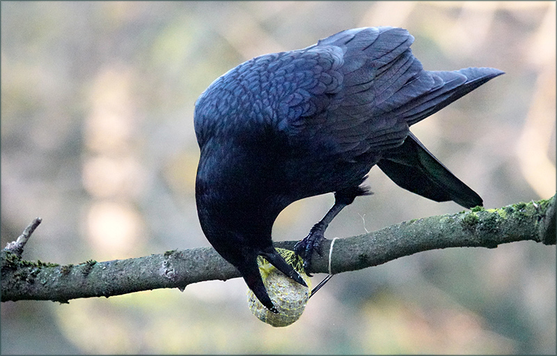 Geschickt, wie er sich das Futter zu Gemüte führt. Für den Raben mit seinem spitzen Schnabel ist es kein Problem an das begehrte Fett des Meisenknödels zu gelangen. Sehr schön getroffen auch sehr schön an Licht und Farbe und voller Harmonie und Frieden.