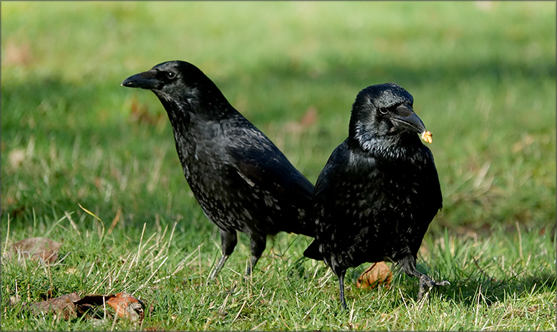 Ich glaube eher, dass es Lichteffekte sind, sie stehen ja im Sonnenlicht, und oft glänzt ihr Gefieder bei Lichteinwirkung. Sehr schön getroffen, der eine beschäftigt sich mit Futter und der oder die andere (wahrscheinlich ein Pärchen), schaut, was sich da im Umfeld tut.