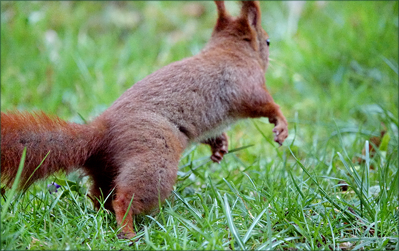 Eichhörnchen inmitten von saftigem Gras im Moment des Losspringens getroffen, sehr schön.