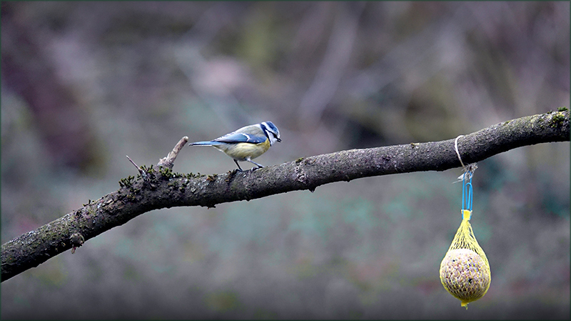 Ein ganz herzliches Dankeschön an die lieben Menschen, die den Tieren über die Jahreszeiten hinweghelfen in denen das natürliche Futter spärlich und manchmal unzureichend ist. Ein schönes Bild, mit dem blauviolett gestalteten Hintergrund, der die Meise auf dem Ast und dem Meisenknödel daran, schön zur Geltung bringt.