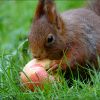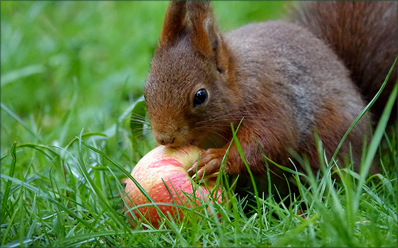 Es sieht mir so aus, als würde es am Apfel genüsslich nagen. Sehr schön getroffen, harmonisch in Licht und Farbe. Niedlich anzuschauen, wie es den Apfel mit den Krallen hält, dabei vollkommen wachsam ist. Auch die frische rötlich und gelbe Farbe des Apfels in dem saftigen grünen Gras wirkt harmonisch auf das Bild. Das bläulich weißgrau schimmernde Fell des Tierchens kommt sehr schön zur Geltung.