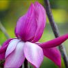 Magnolien, ich liebe sie. Ich bin heute früh auf dem Weg um eine Kleinigkeit einzukaufen vor dem Magnolienbaum, an einem Wohnhaus, der in voller Blüte steht, stehen geblieben und habe ihn eine Weile betrachtet. Die Blüten sind von leuchtend weißer Farbe mit etwas rosa darin, immer ein schönes Erlebnis. Diese Blüte hier ist wunderschön und kommt vor dem bläulich bis grüngelblich gefleckten Hintergrund mit ihrer violett rosa bis weißfarbenen Pracht und den Tau- oder Regentropfen schön zur Geltung. Mit den bläulich grauen Zweigen auch ein Kunstwerk der Natur und des Fotografen. Ein sehr schönes Licht- Farbverhältnis.