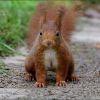 Ein sehr schönes Bild, aufgeteilt in etwa zwei diagonalen Hälften, die linke obere Hälfte aus grünem Grasbewuchs und die rechte untere Hälfte ein Weg aus bläulichgrauem zerkleinerten Schotter. Mitten darin auf dem Weg das süße aufmerksam schauende Eichhörnchen. Gut getroffen, sehr schön in Licht und Farbe und voller Harmonie und Frieden.