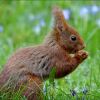 Eichhörnchen auf einer Frühlingswiese, ein Bild voller Harmonie und Frieden. Die Tau- oder Regentropfen an den Grashalmen unterhalb des Bildes wirken wie kleine Perlen. Schön zu sehen die Haltung des Tieres, der wachsame Blick und wie es genüsslich an dem Futter knabbert. Das Bild vermittelt das schöne Gefühl von Frühlingsfrische auch sehr schön an Licht und Fabe.
