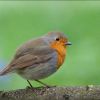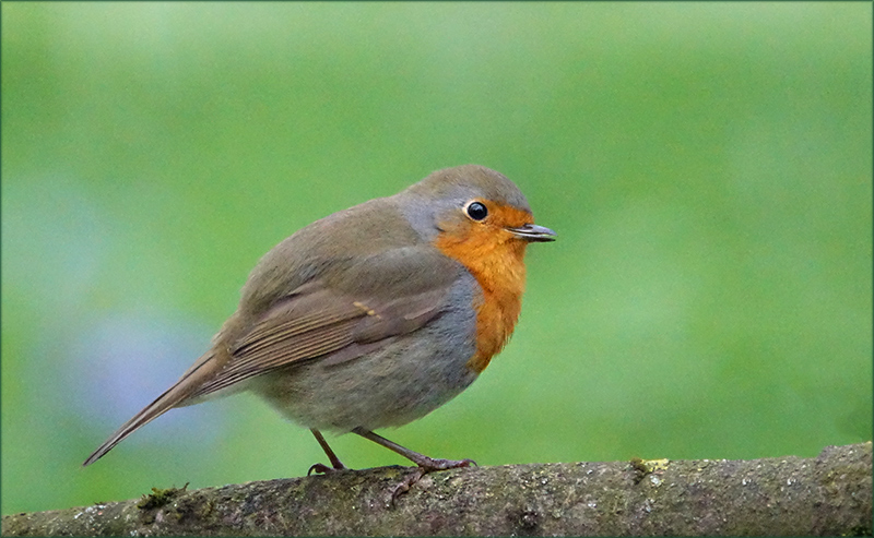 Sein lieblicher Blick, sein rötliches Brüstchen, sein Schnäbelchen und sein weiteres graues Gefieder, das Rotkehlchen in seiner Gesamtheit, vermittelt ein herzerwärmendes Gefühl von Liebe. Auf dem quer durchs Bild verlaufenden grauen Ast unterhalb des Bildes steht das süße Tierchen und schaut aufmerksam was geschieht. Der grünlich bis bläulich gefleckte Hintergrund bringt das Vögelchen schön zur Geltung.