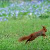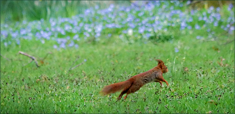 Ein schöner Schnappschuss, das Eichhörnchen, ausgestreckt im Sprung, mit der Kamera eingefangen, inmitten der schönen Frühlingswiese. Die dunkelen bis schwarzen Blütenpunkte im grünen Gras in der unteren Hälfte des Bildes und die bläulichen verschwommenen Blüten in der oberen Hälfte, geben dem Bild ein frisches Aussehen. Auch sehr schön in Licht und Farbe.