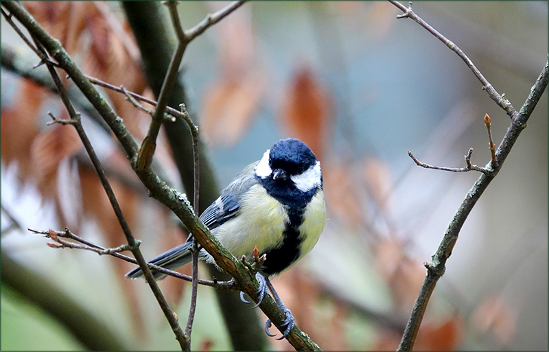 Paradies "Natur". Eine Kohlmeise im Geäst, welkes Laub verschwommen im Hintergrund und zartes blau des Tageslichtes. Das süße Vögelchen in seinem prächtigen Federkleid, wachsam die Äugelchen zur Kamera gerichtet, schaut was geschieht. Die Zweige treiben Knospen, der Zyklus des Lebens in der Natur beginnt mit dem Wachstum, der Frühling hält Einzug. Ein Bild voller Harmonie und Frieden, sehr schön in Licht und Farbe.