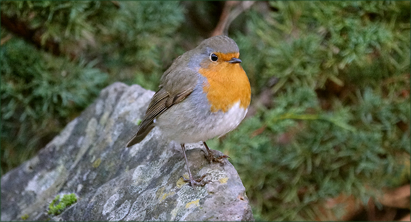 Paradies "Natur". Ein wunderschönes Bild, sehr schön getroffen, das süße Rotkehlchen, stehend auf dem bläulichgrau gefleckten Steinbrocken in seinem schönen Gefieder, mit der Farbe des Steines harmonierend. Die Äugelchen wachsam schauend, das Schnäbelchen nach vorne gerichtet. Der grünbewachsene Hintergrund gibt dem Bild im Vordergrund einen schönen farblichen Wohlklang, voller Harmonie und Frieden und es besteht ein schönes Lichtverhältnis. Schön auch zu sehen das grüne Moosbüschelchen links auf der schrägen Wand des Steinbrockens.