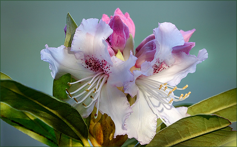 Rhododendronblüten sind wunderschön, diese hier im leuchtenden weiß mit violetten Pünktchen nach innen hin und die noch geschlossenen Blütenknospen in einem zarten Violettton. Sehr schön zu sehen, die Griffel mit den Pollenständen, die sich voller Lebensdrang für die Befruchtung nach außen strecken. Licht und Schatten geben den Blüten einen besonderen Liebreiz.