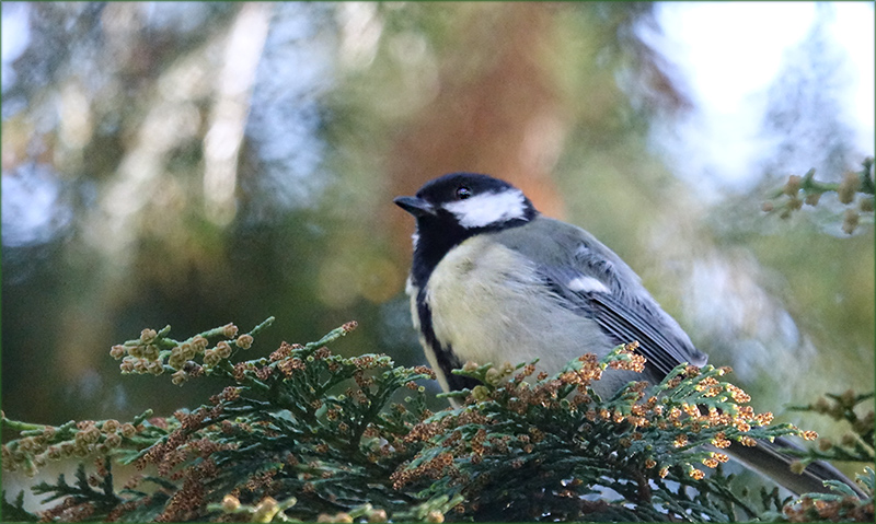 Friedlich und still, sitzt die Kohlmeise auf der Krone des Baumes oder Strauches und schaut was geschieht. Ihr schönes Gefieder harmoniert farblich mit dem bläulich einfallenden Licht im Hintergrund...Sehr schön getroffen, eine Pracht an Licht und Farbe und voller Harmonie und Frieden.