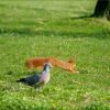 Wildtiere, sind in Freiheit untereinander eigentlich friedlich. Die Taube hier auf dem Bild schaut zwar nach dem springenden Eichhörnchen aber sie flüchtet nicht, sie weiß, dass sie für das Eichhörnchen kein Beutetier ist...Sehr schön getroffen, Taube und Eichhörnchen auf der Frühlingswiese, mehrere verschiedene Wildtiere bekommt man nicht so oft zusammen aufs Bild. Der Baumstamm oben rechts in der Ecke auf dem Bild, trägt zur Harmonie des Bildes bei. Sehr schönes Licht- Farbverhältnis.