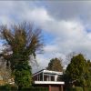 Ein idyllisches Wohnverhältnis, ein Flachdachhaus, von Bäumen und Sträuchern umgeben, in friedlicher Harmonie. Die etwas aufgelockerten Wolken lassen den blauen Himmel durchscheinen und geben wechselweise die Sonne frei. Aprilhimmel, Aprilfrische, ein friedliches Zuhause, umgeben von reichlich Natur, ein kleines Paradies.