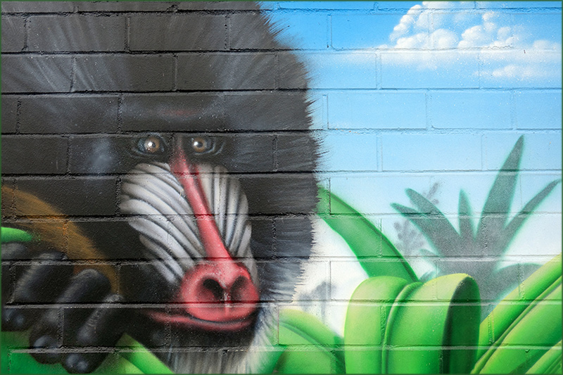 Ein schönes Kunstwerk der Mandrill. Es sieht mir so aus, als wäre das Tier in fremder kultivierter Umgebung, es sieht nicht nach Regenwald aus, wo die Mandrille eigentlich zuhause sind, und sie sollen vom Aussterben bedroht sein. Schön getroffen das Bild.