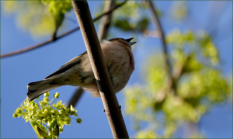 Der kleine Vogel auf dem Zweig sitzend, singt gerade so schön im Sonnenschein, umgeben von leuchtenden Frühlingsblüten. Schön auch mal das Gefieder des Vogels von der Unterseite her zu sehen. Der blaue Himmel, die grünlichen Blüten und die noch zarten Blätter mit den Zweigen und dem Vogel auf einem davon im bereits wärmenden Schein der Sonne, verströmen Harmonie und Frieden. Nahrung für unsere Seele, einströmende Energie.