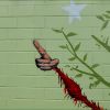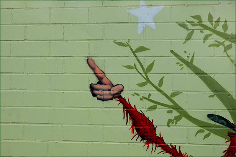 Das Graffitikunstwerk hier sagt ganz klar etwas aus, im Gegensatz zu anderen Graffitis, die ein Gewirr von Bogen, Spitzen, verzerrten Buchstaben usw. darstellen. Es besteht aus vier Farben: Dunkelrot der verkümmerte oder verkrüppelte zerfranste Arm, fleischfarben, die nichtentstellte menschliche rechte Hand mit gestrecktem Zeigefinger in die Höhe weisend, hell- oder olivgrüne Schatten von Ästen und Zweigen mit Blattwerk, und darüber ein fünfzackiger hellbläulicher Stern. Der Zeigefinger könnte irgend etwas am Himmel zeigen oder auch auf etwas hinweisen. Ich glaube man kann einiges in das Bild hineinprojizieren. Es wirkt in Form und Farbe harmonisch.