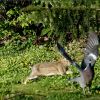 Es könnte auch sein, dass die Taube gerade im Landeanflug ist, als das Kaninchen wegrennt, oder dass beide Tiere von irgend etwas gestört wurden, das sich während des fotografierens näherte. Sehr schön getroffen, schönes Licht- Schattenverhältnis.
