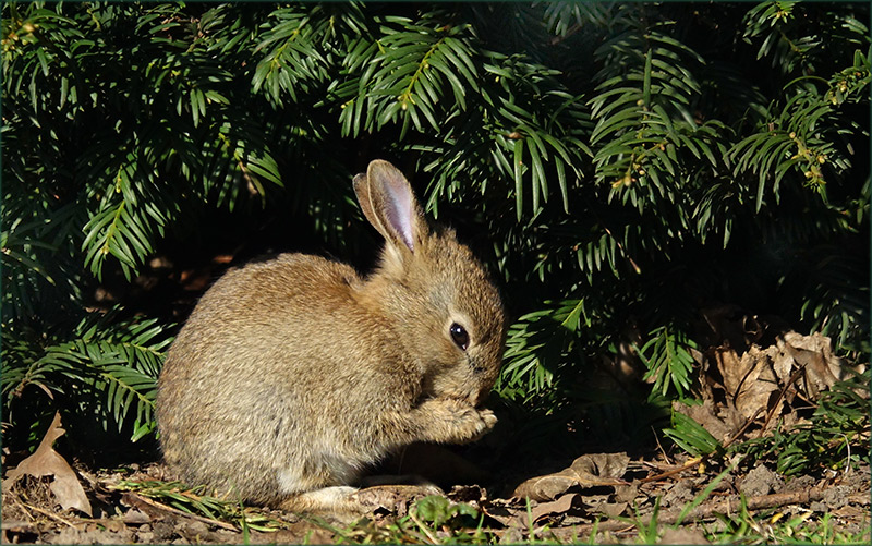 Das süße Wildkaninchen genießt am Rande des Gehölzes den Sonnenschein und kann, wenn es sich bedroht fühlt sofort ins schützende Dickicht flüchten. Es putzt seine Vorderpfoten und ist dabei äußerst wachsam. Sehr schönes Lichtverhältnis.