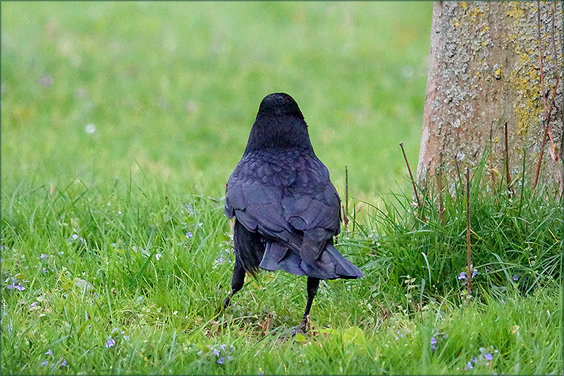 Sehr schön getroffen den Raben, sein prächtiges bläulich schimmerndes Federkleid vom Rücken her. Die Frühlingswiese mit dem Baumstamm auf der rechten Seite des Bildes, dem saftigen Gras und den blauen Blümchen, bringt den Vogel schön zur Geltung. Ein schönes Licht- Farbverhältnis.